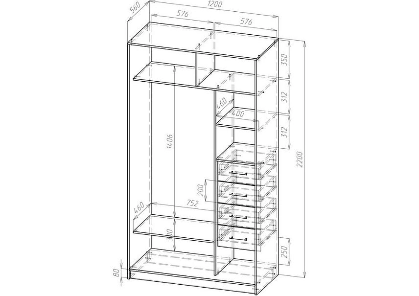 3. Если высота шкафа превышает 2200 мм, рекомендуется добавить дополнительную полку в секцию с полками.